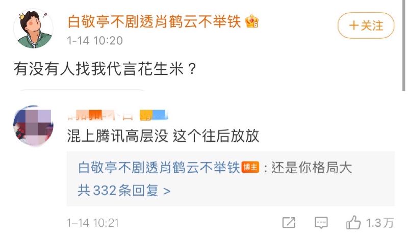 當白敬亭小號問:「有沒有人找我代言花生米?」,被粉絲懟:「混上騰訊高層沒?這個往後放放!」時,很坦然接受批評表示:「還是你格局大」!真的快被這家的粉絲和正主笑死啦!