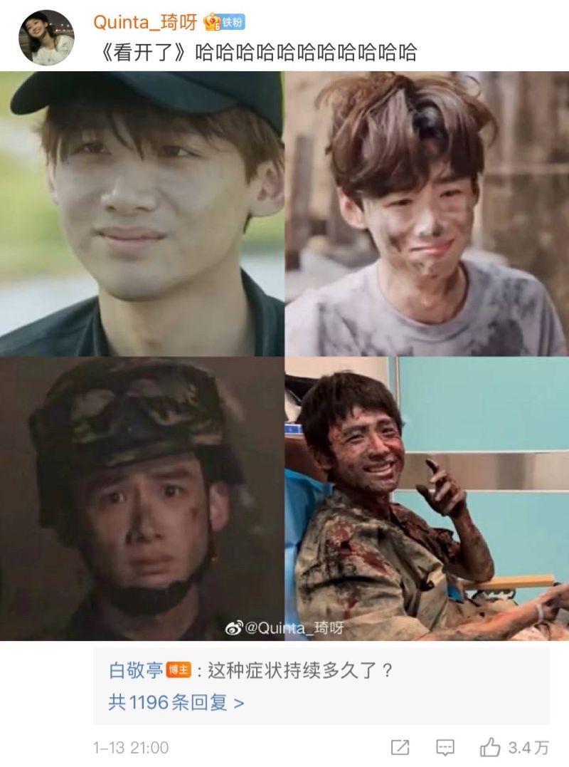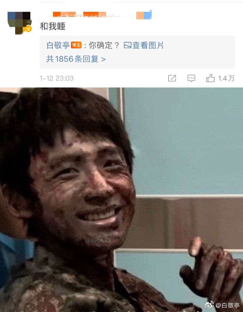 當被粉絲調戲問:「和我睡?」時,直接拋出自己在《開端》中被炸得烤焦的“黑敬亭”照片,重問:「你確定?」
