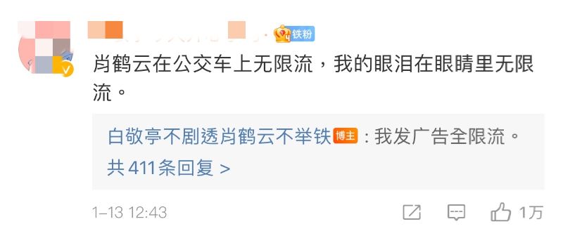 除了發表遠大的夢想,小白的評論區一直都很熱鬧,和粉絲一來一往好不精彩!這就再來看看經典留言,像是當粉絲幫忙安利《開端》:「肖鶴雲(小白劇中角色名稱)在公交車上無限流,我的眼淚在眼睛裡無限流。」時,會很押韻又現實的回復:「我發廣告全限流。」
