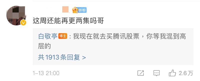 當被粉絲問:「這週還能再更兩集嗎?哥!」,直接回復:「我現在就去買騰訊股票,你等我混到高層的!」哈哈哈哈哈哈哈哈哈哈哈哈哈哈哈哈哈哈哈哈哈哈哈~好!我就等你混高層!
