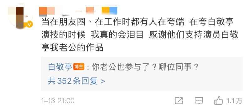 最經典的來啦!當粉絲花式彩虹屁在稱讚自己時:「當在朋友圈,在工作時都有人在誇端(開端)、在誇白敬亭演技的時候,我真的會淚目,感謝他們支持演員白敬亭我老公的作品!」猜猜小白怎麼應付女友粉???答案是…:「你老公也參與了?哪位同事?」哈哈哈哈哈哈哈哈哈哈哈哈哈哈哈哈哈哈哈哈哈哈哈,絕!小白果然最絕!!!!