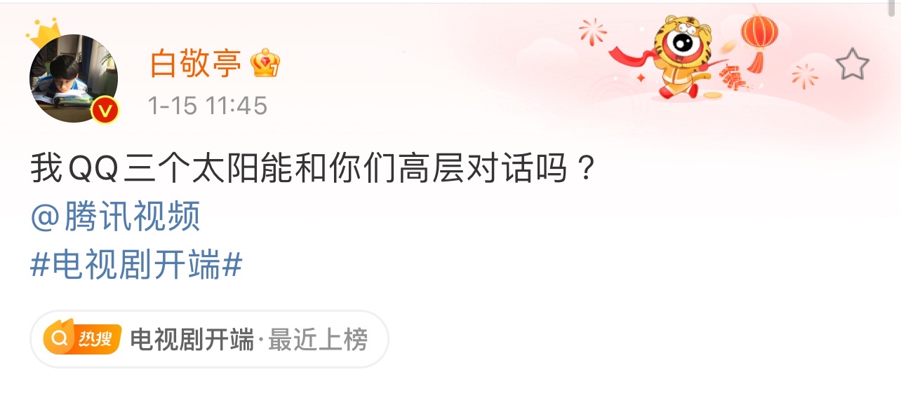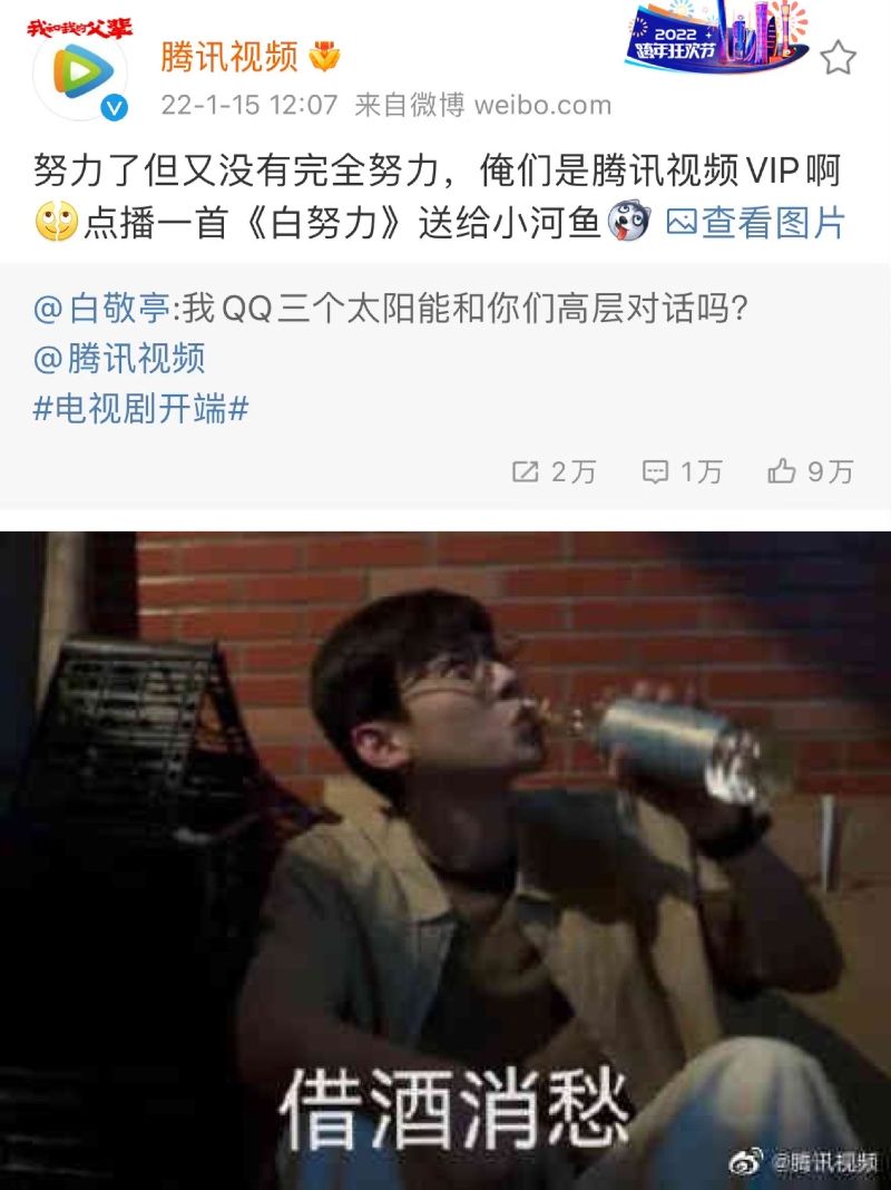 後來更表示:「努力了但又沒有完全努力,俺們是騰訊視頻VIP啊!點播一首《白努力》送給小河魚(小白《開端》角色肖鶴雲的諧音)」還配上了小白借酒消愁的梗圖,果然要對應小白,梗圖絕對少不了!