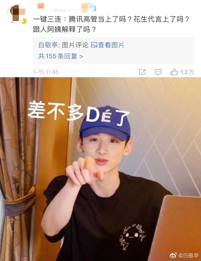 更有人反問小白:「一鍵三連:騰訊高管當上了嗎?花生代言上了嗎?跟人阿姨解釋了嗎?」面對網友三連問,小白直接丟出“差不多de了”的梗圖對應!