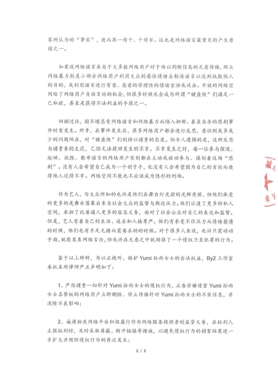 工作室全文:「早前,李靚蕾小姐公開影射Yumi介入其婚姻,並索要警方聯繫方式稱要提供證據。