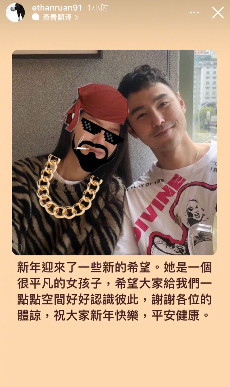 5號晚間,阮經天更新INS動態,官宣自己在戀愛中,並公開了和女友的合照,配文:「新年迎來了一些新的希望。她是一個很平凡的女孩子,希望大家給我們一點點空間好好認識彼此。謝謝各位的體諒,祝大家新年快樂,平安健康。」