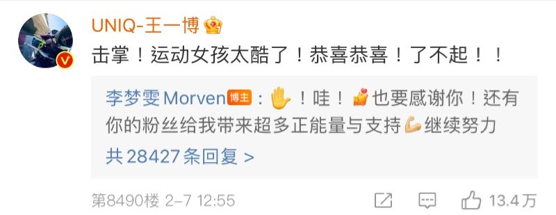 沒想到王一博隨後也在評論區留言,表示:「擊掌!運動女孩太酷了!恭喜恭喜!了不起!!」讓李夢雯也興奮的回復:「:✋!哇!也要感謝你!還有你的粉絲給我帶來超多正能量與支持[加油]」兩個出色的人隔空擊掌,互相鼓勵!