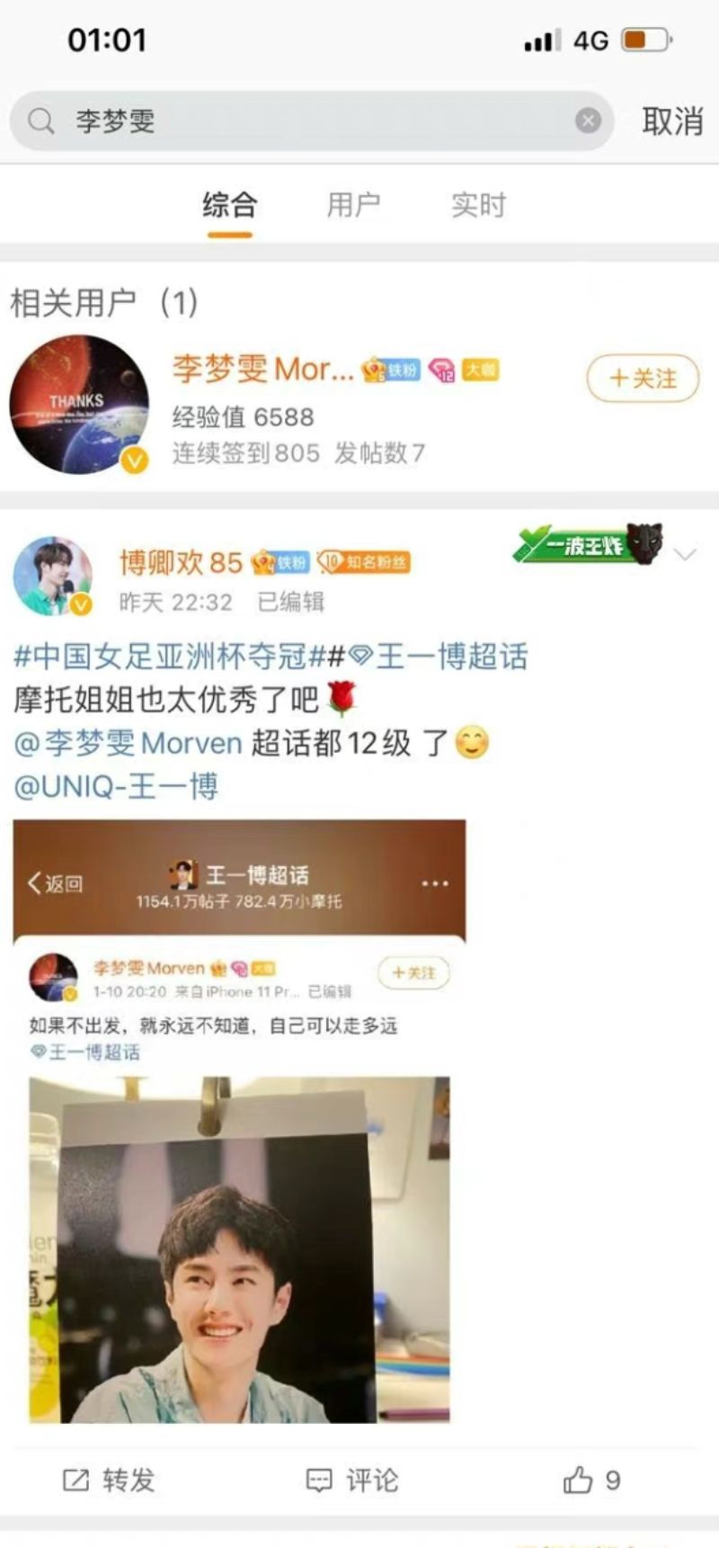 表示李夢雯不但簽到了805天,在王一博超話也已經到達12級,真的是不折不扣忠實粉絲!甚至還連續兩年發文為王一博慶生👇