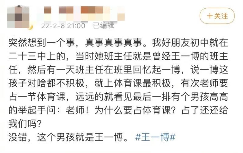 該網友分享全文:「突然想到一個事,真事真事真事。我好朋友初中就在二十三中上的,當時她班主任就是曾經王一博的班主任,然後有一天班主任在班裏回憶起一博,說一博這孩子對啥都不積極,就上體育課最積極,有次老師要占一節體育課,遠遠的就看見最後一排有個男孩高高的舉起手問:老師!為什麽要占體育課?占了還還給我們嗎?沒錯,這個男孩就是王一博。 」