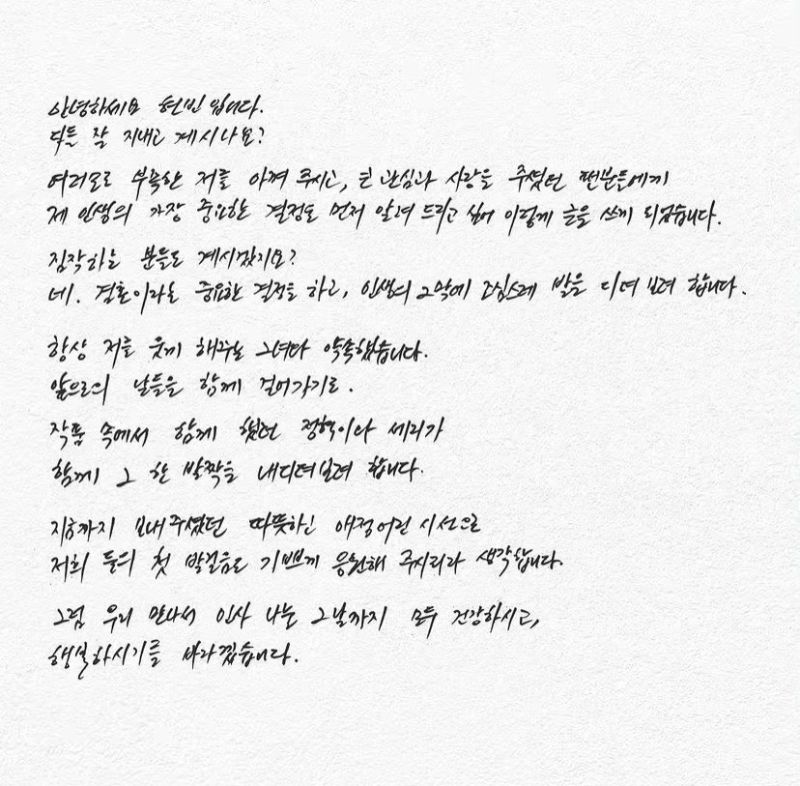 玄彬在社交平台公開了自己和孫藝珍的牽手照,並公開親筆信向粉絲宣佈這個好消息,玄彬手寫信全文如下: