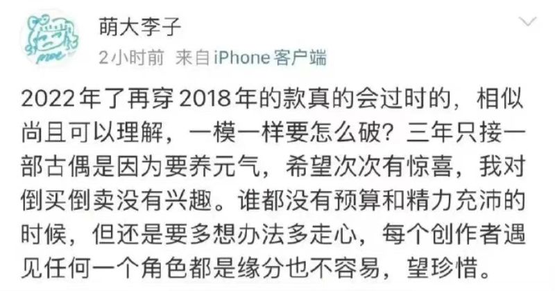 隨後,萌大李子也在自己微博再發聲明,再次表達自己的不滿,希望創作者(此處應指的是嫣語賦造型師)可以多想辦法多走心。