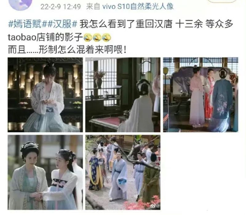 這就來看看網友扒出的細節,先是有網友發稿表示,嫣語賦的戲服就像大型淘寶店鋪展示台,而且年代背景也混著來👇
