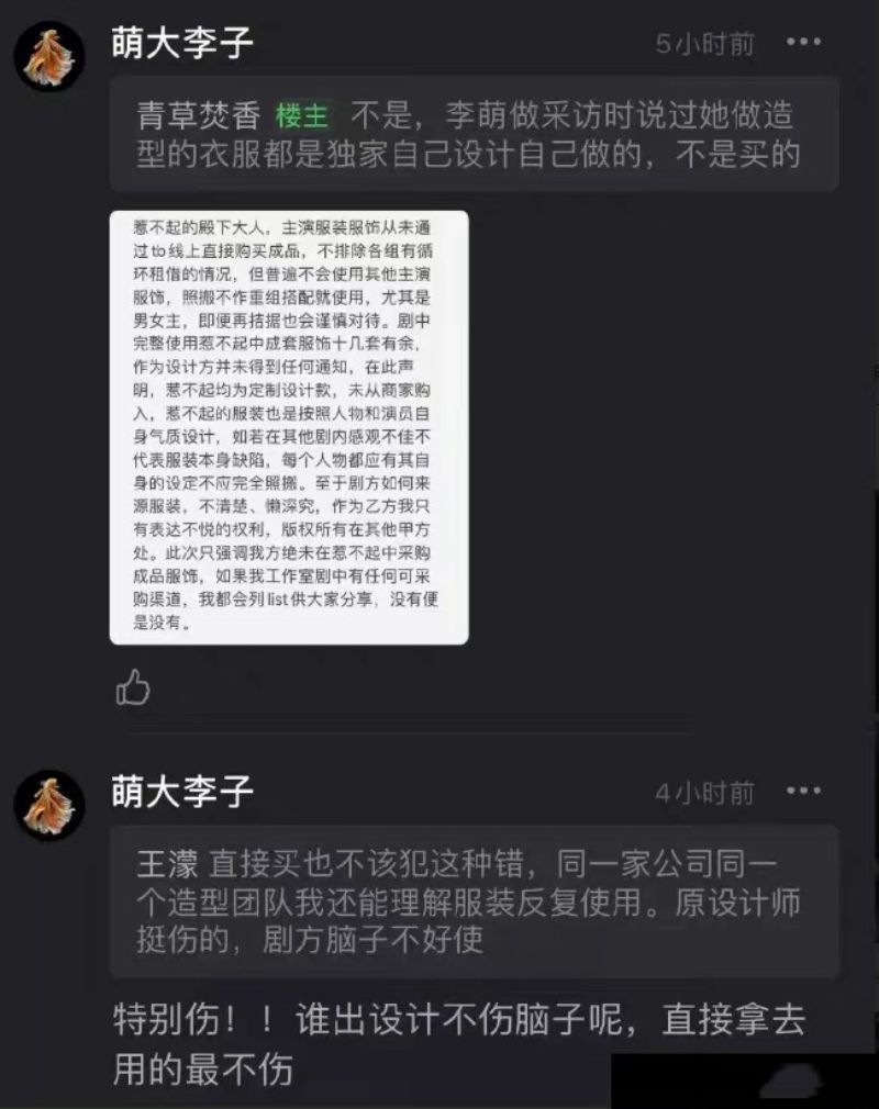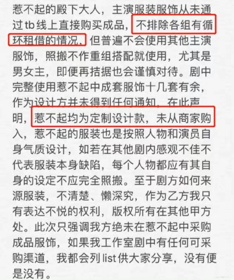 這引來了《惹不起的殿下大人》造型師萌大李子直接下場,回復網友表示《惹不起》主演服裝從未通過淘寶線上直接購買成品,但不排除有“循環租借”的情況。不過她也強調,一般如果主演的話,並不會直接不做重組搭配就使用,尤其是男女主,即使預算在有限也會謹慎對待。而《嫣語賦》劇中完整使用了惹不起成套服飾十幾套,作為設計方卻從未收到通知,所以特發聲明。