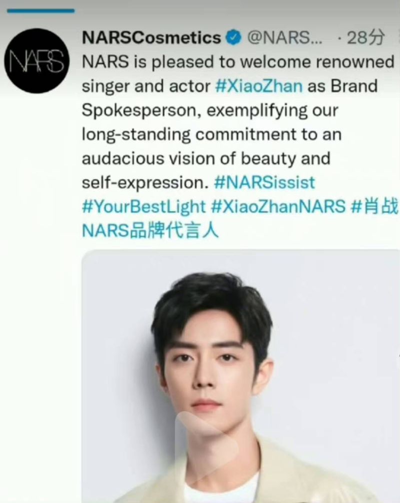 當然,這僅是肖戰那麼多代言的其中一個戰績。而2月20日,肖戰迎來了今年第一個化妝品牌的代言,也就是1994年創立的NARS,而且更成為了全球品牌代言人。這也是NARS創立以來,第一次官宣品牌代言人👇