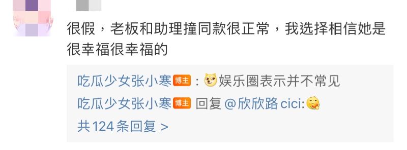 至於明星和助理有同款究竟是不是正常呢?曾有網友在爆料吳奇隆外遇的狗仔微博下留言,表示:「很假,老闆和助理撞同款很正常,我選擇相信她是很幸福很幸福的」,被該狗仔回復:「娛樂圈並不常見。」