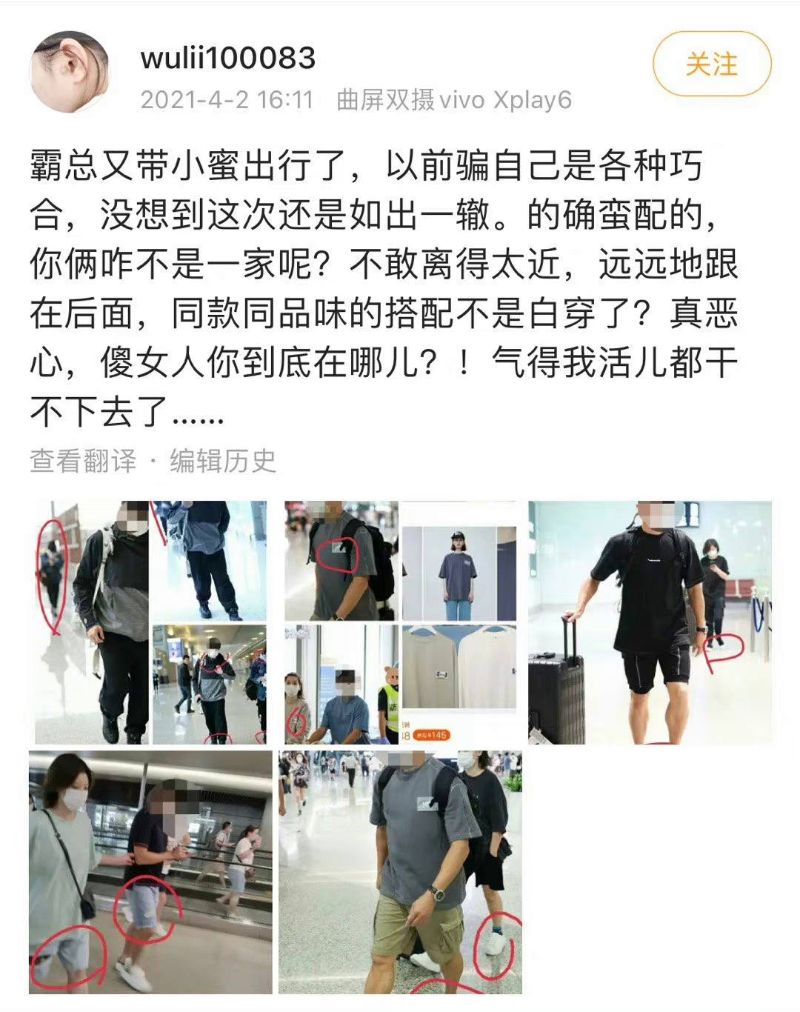 而在她曬吳奇隆和助理同款的貼文,他表示以前總是自我欺騙是巧合,沒想到這次還是一樣,甚至不敢靠的太近,真惡心!還喊話“傻女人”你到底在哪兒!