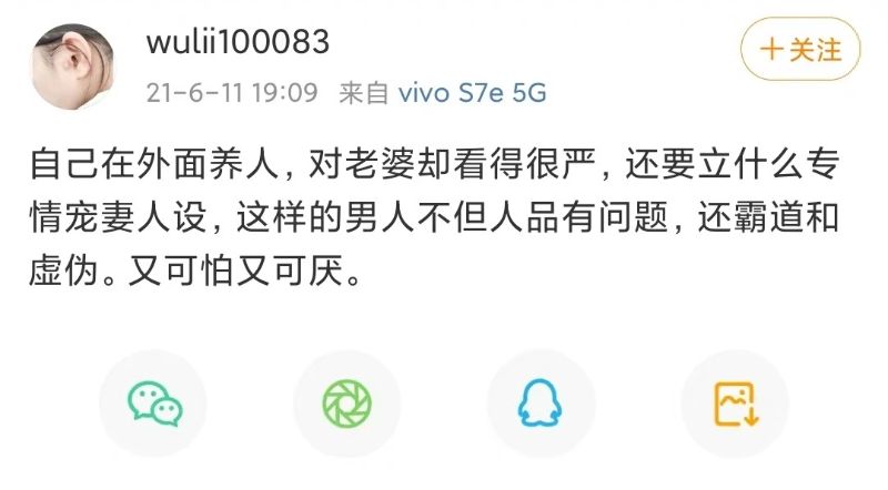 該網友發文:「自己在外面養人,對老婆卻看的很嚴,還要立什麼專情寵妻人設,這樣的男人不但人品有問題,還霸道和虛偽。又可怕又可厭。」