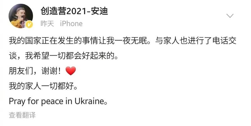 哎,真的是祈求世界和平啊!是噠,俄羅斯在24號向烏克蘭發起戰爭,引起全球關注!而曾參加《創造營2021》的烏克蘭選手安迪,也發文回應!