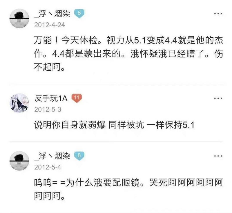 也有粉絲挖出蔡徐坤14歲時發的評論,當時他就說自己做視力檢查時,看視力表已經從5.1變成4.4,嚴重懷疑自己已經瞎了,還哭訴「為什麼涐要配眼鏡,酷似啊啊啊啊啊啊」艾古,用火星文的蔡小葵真的太可愛了啦!