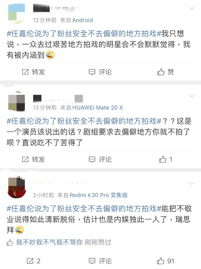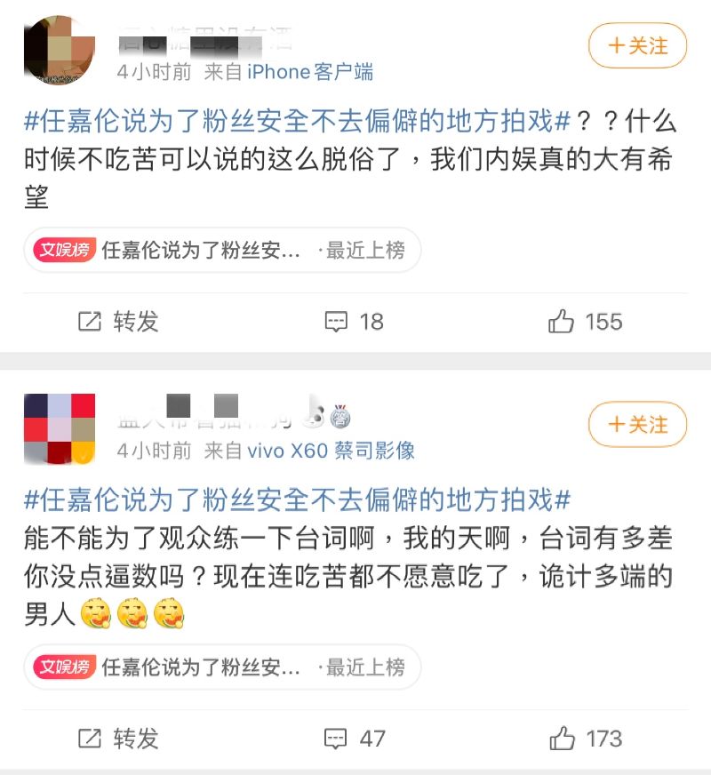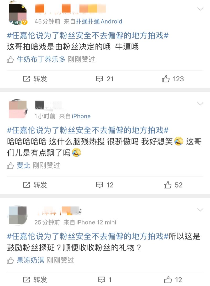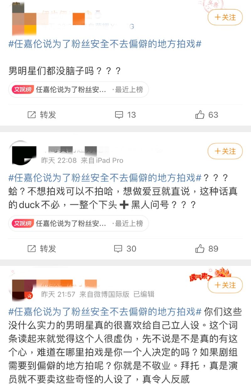 原來在直播中,任嘉倫提到為了粉絲安全,所以不會去太偏僻的地方拍戲,結果「#任嘉倫說為了粉絲安全不去偏僻的地方拍戲#」立刻上了熱搜,這個熱搜詞條下不少網友都在罵國超不敬業👇