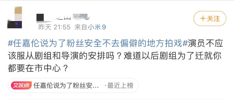 原來在直播中,任嘉倫提到為了粉絲安全,所以不會去太偏僻的地方拍戲,結果「#任嘉倫說為了粉絲安全不去偏僻的地方拍戲#」立刻上了熱搜,這個熱搜詞條下不少網友都在罵國超不敬業👇