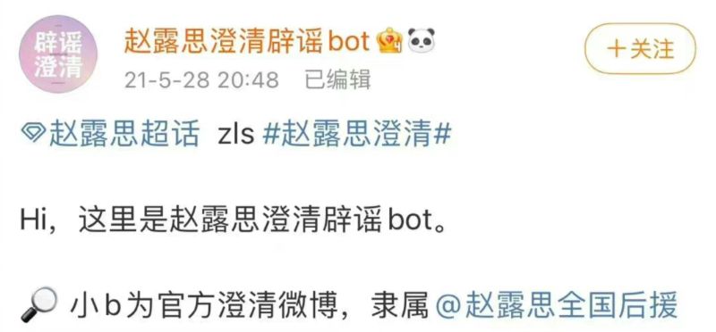 這裡科普一下,這個闢謠bot賬號隸屬於趙露思後援會,也算是官方認可的微博號,