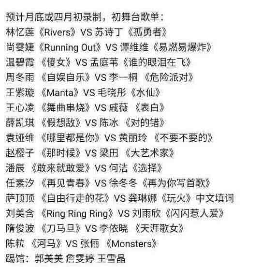 最後,最新網傳版本的浪姐3初舞台錄製名單也曝光,甚至連歌單都有啦!!!!!👇