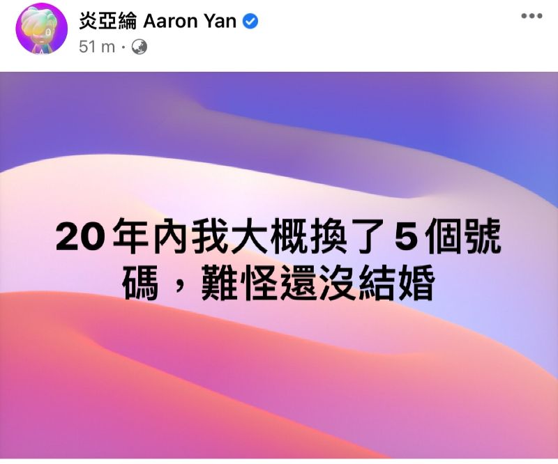 沒想到炎亞綸也在關心大S婚訊,更發文表示:「20年內我大概換了5個號碼,難怪還沒結婚!」引起不少網友共鳴,原來自己還單身的原因是這個啊!
