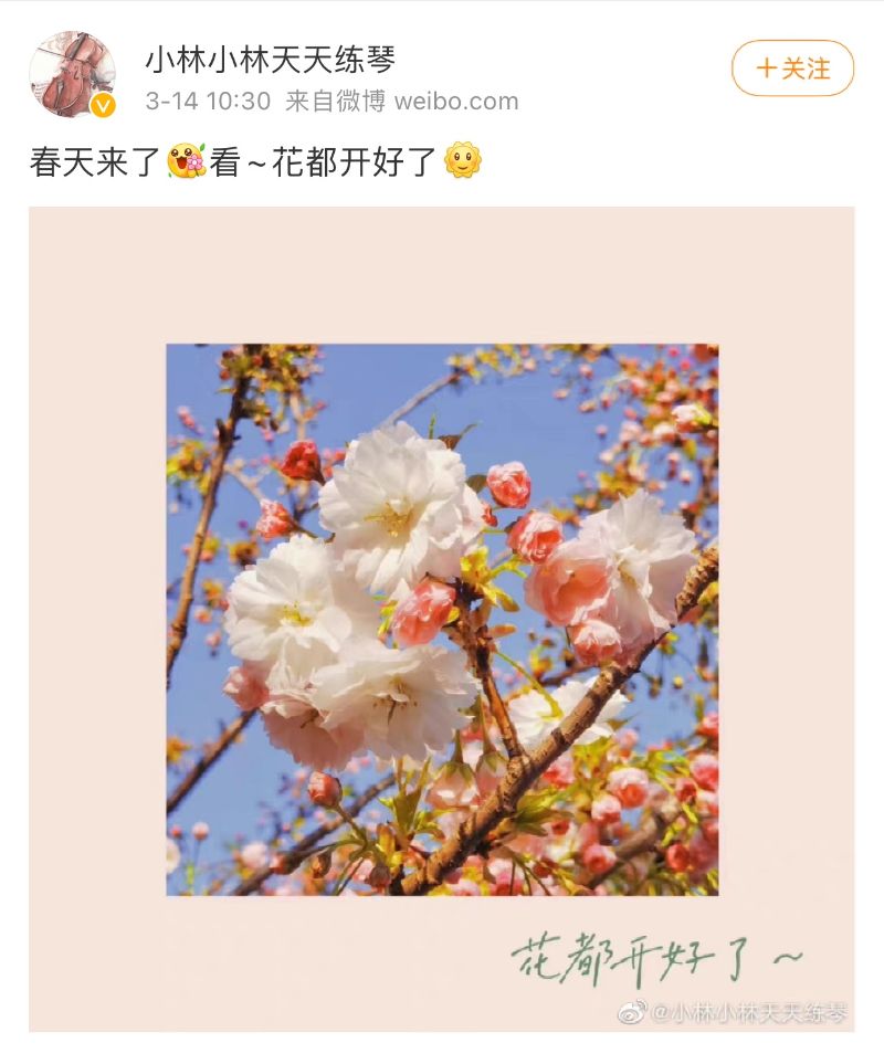 小太陽林之校也更博啦!一樣貼出了春天感十足的照片,表示:「春天來了,看~花都開好 了!」