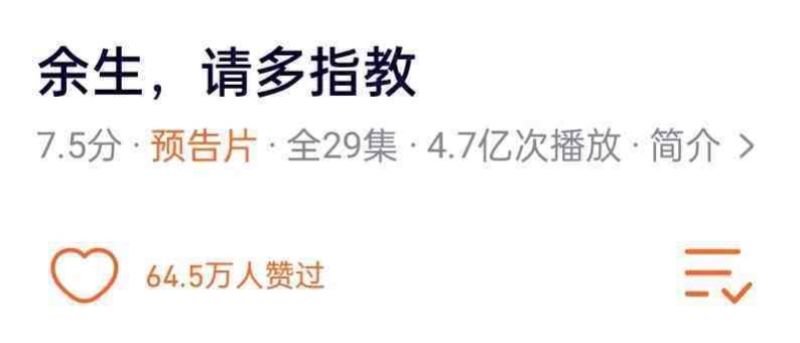 另外,《余生請多指教》另一超能打數據,就是預告片已經突破4.7億次播放!!!能想象嗎?有些劇或許全套播放量都沒突破1億,但余生僅預告就突破4.7億次啊!