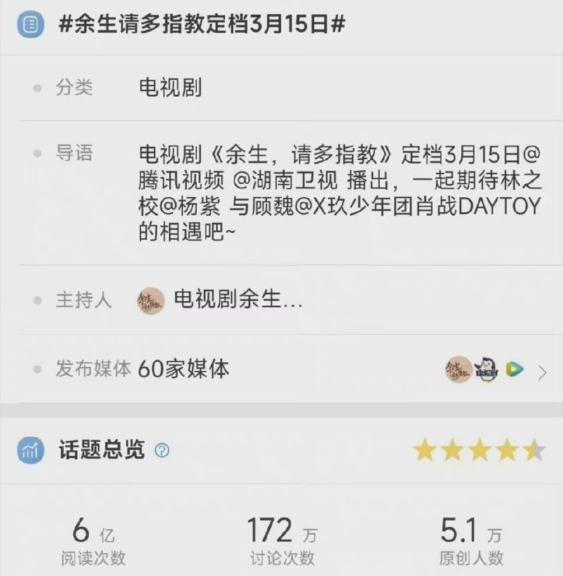 也來看看今天官宣定檔之後,「#余生請多指教定檔3月15日#」的詞條就擁有6億閱讀次數,高達172萬討論次數,這些數字看起來只有一個概念,那就是…很強!
