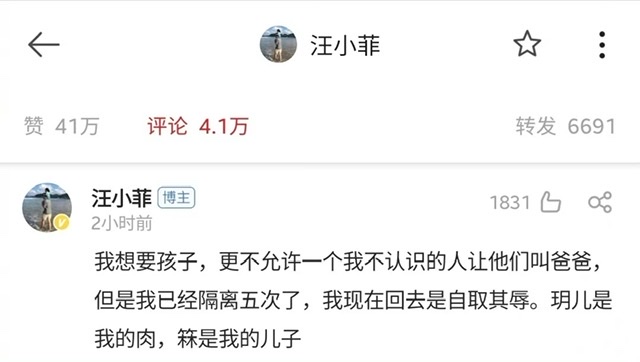 汪小菲全文:「我想要孩子,更不允許一個我不認識的人讓他們叫爸爸,但是我已經隔離五次了,我現在回去是自取其辱。 玥兒是我的肉,箖是我的兒子。」