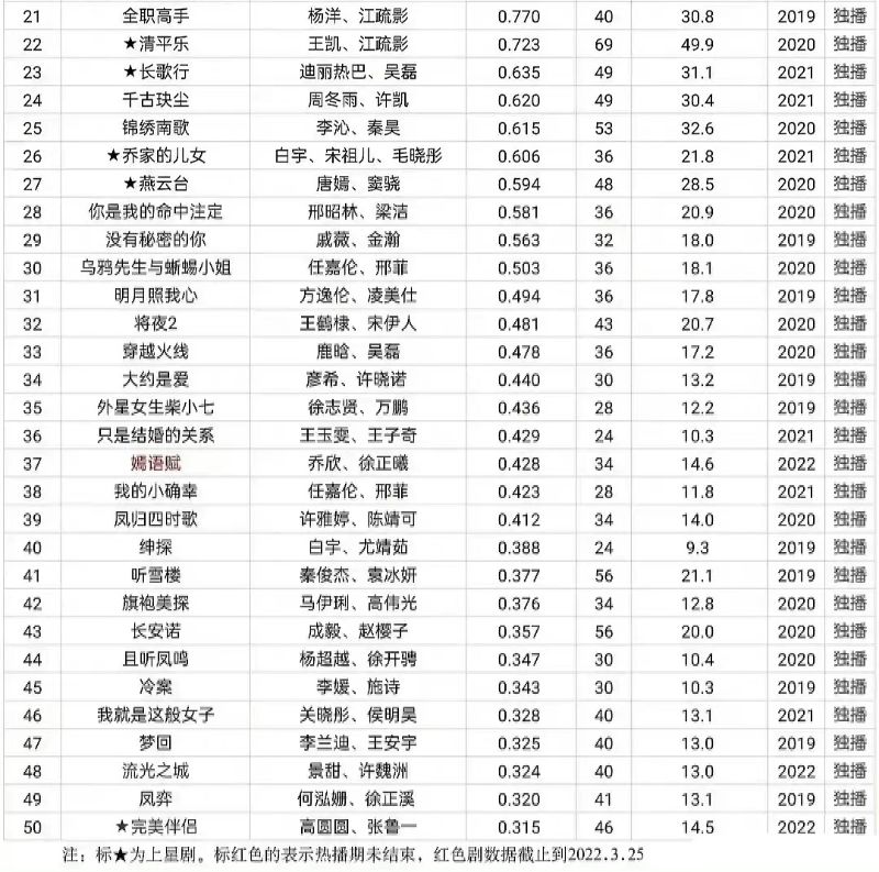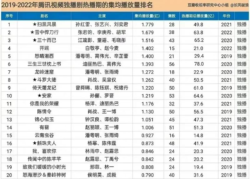 來看數據帖唄!沒錯,這就來看看網友總整理的,騰訊視頻在2019年至2022年中,在熱播期時集均播放量最高的前50部電視劇!這裡必須提醒的是,這50部電視劇播放量僅計算熱播期間,也就是說劇終之後的”長尾效應“並不納入統計之中,算是真正的即時播放量啦!這就先看看前Top 20部的數據吧!