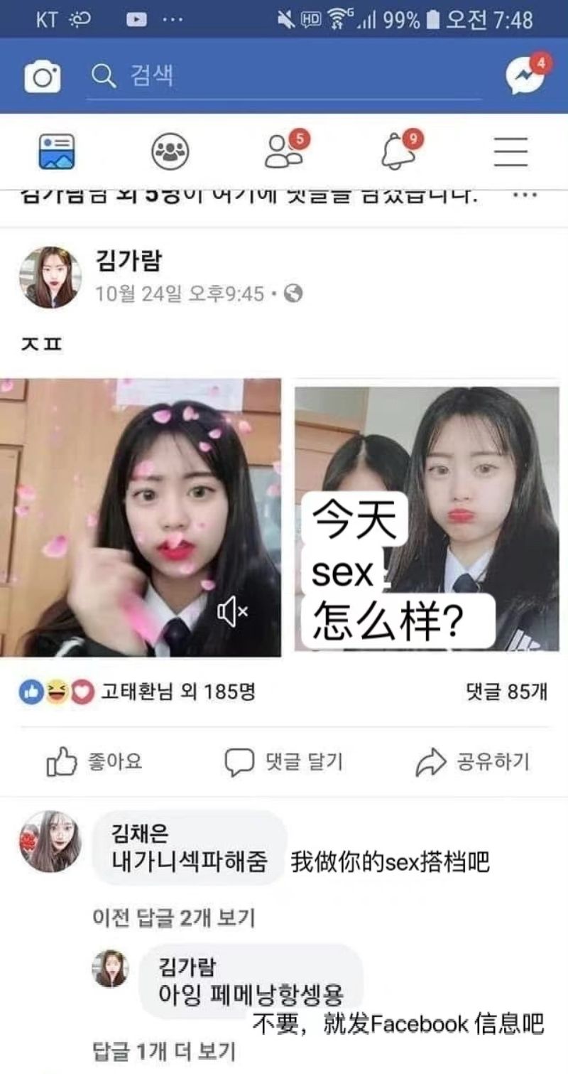 在韓網友公開的截圖中,顯示Garam和網友對話,提到了性行為相關內容👇