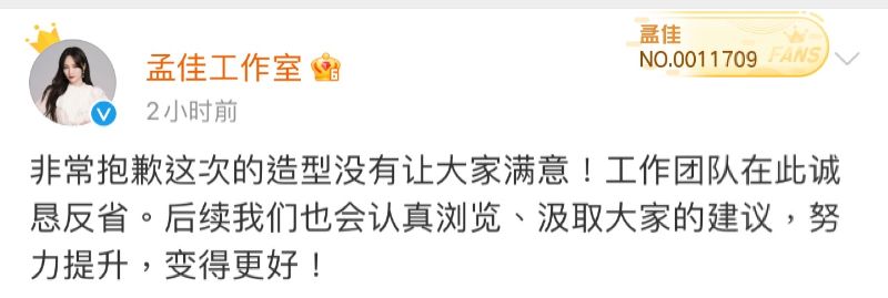 而工作室也轉發並表示:「非常抱歉這次的造型沒有讓大家滿意!工作團隊在此誠懇反省。後續我們也會認真浏覽、汲取大家的建議,努力提升,變得更好!」