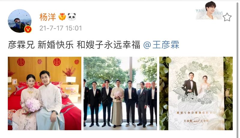 沒事,社死的不只你,還有那位被全網cue趕不上吃席的楊洋啊!!!是噠,這裡再回顧一下,當時楊洋發文祝賀王彥霖新婚快樂👇