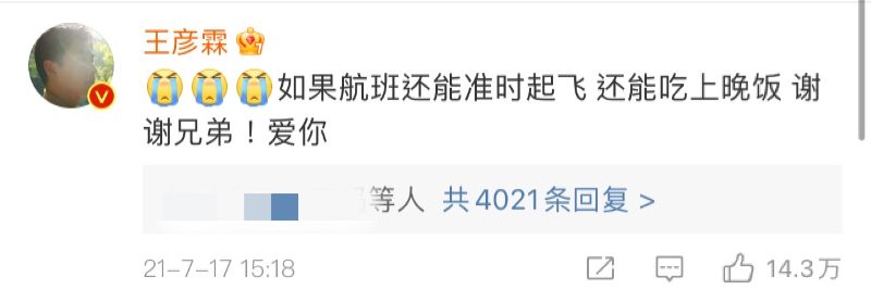 結果王彥霖回復表示:「如果航班還能準時起飛,還能吃上晚飯,謝謝兄弟!」