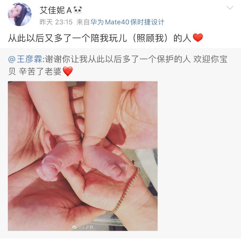 沒想到在10號晚上,王彥霖發文官宣當爸爸了,表示:「謝謝你讓我從此以後多了一個保護的人,歡迎你寶貝,辛苦了老婆❤️」,而妻子也轉發表示:「從此以後又多了一個陪我玩兒(照顧我)的人❤️」