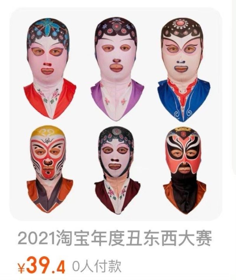 沒錯,就是他手上的臉基尼啦!!!這組臉基尼來頭不小,居然還有一整套,而且…還入圍了淘寶2021年度的醜東西大賽👇