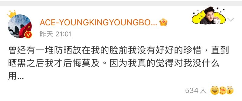 就連他自己也發文,表示:「曾經有一堆防曬放在我的臉前我沒有好好的珍惜,知道曬黑之後我才後悔莫及。因為我真的覺得對我沒什麼用…」