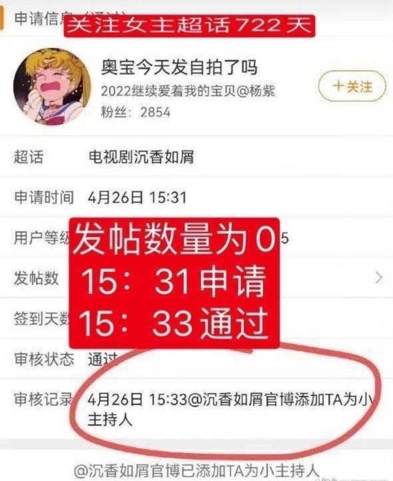 但事實上,之所以會上熱搜,是因為官博最近空降了一位粉絲當超話主持,一申請超話主持就立刻被批准👇