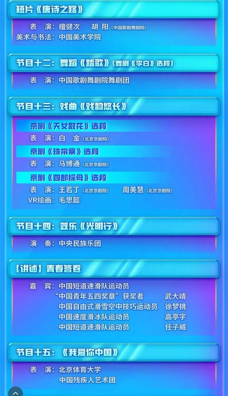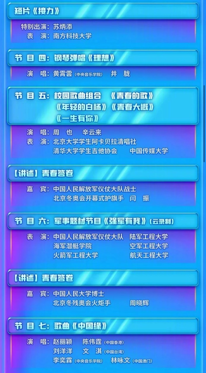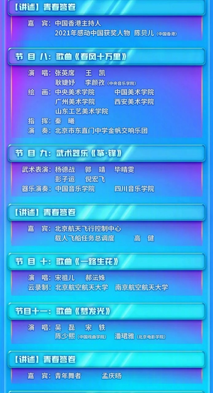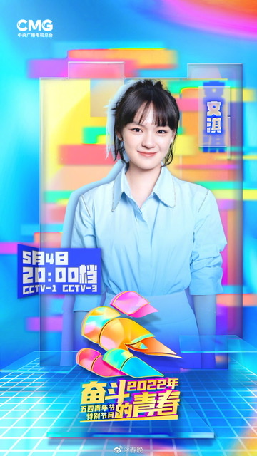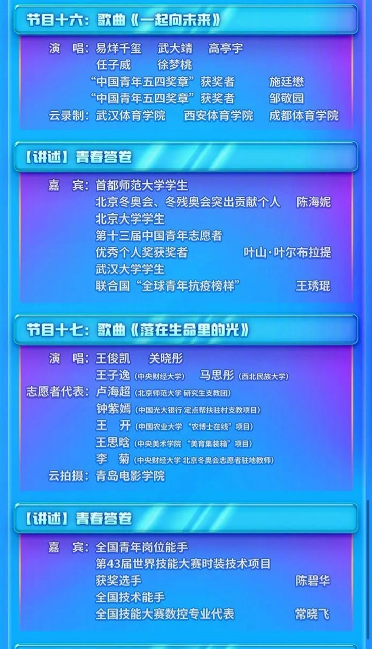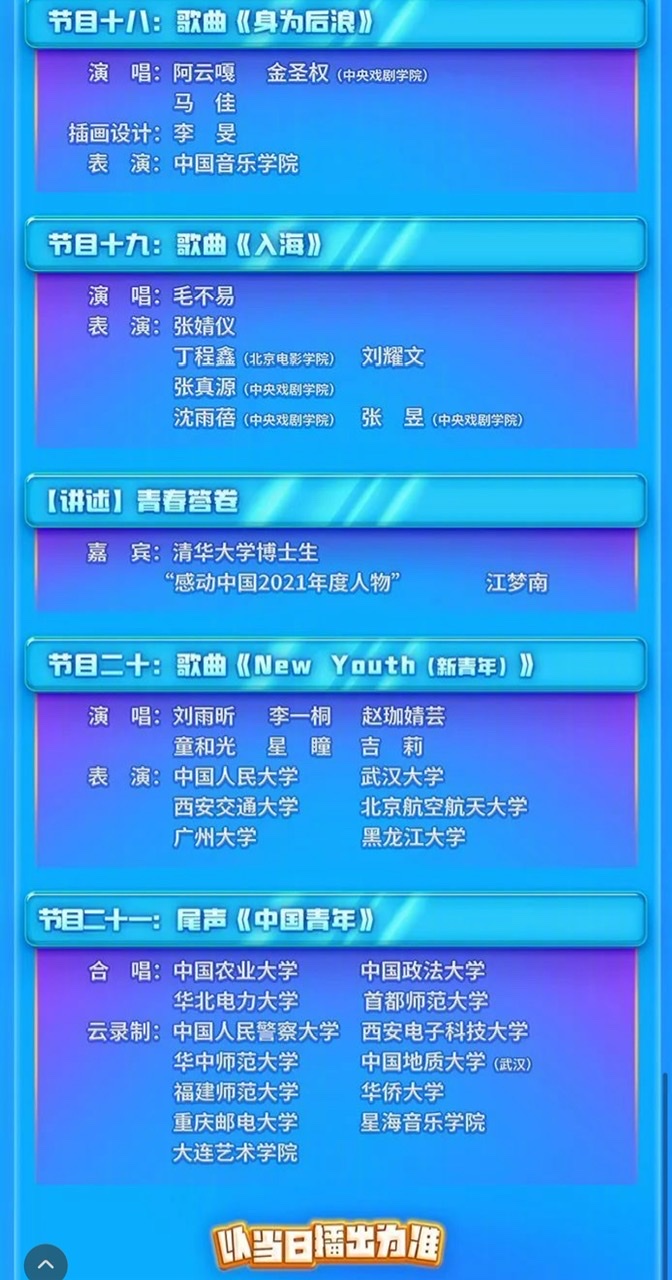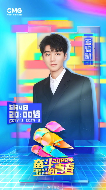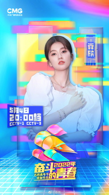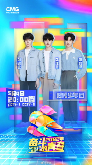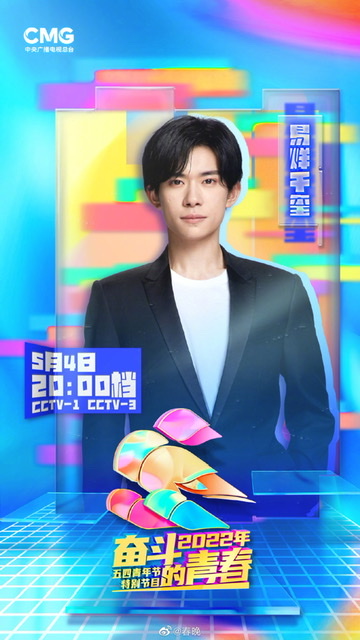 央視爸爸《五四青年特別節目》節目表來啦!超過30組藝人陪你見證青春的力量! 星聞 By 歐巴是我的 On May 4, 2022 Share 央視爸爸出動,大牌們都來啦!是達,配合五四青年節,央視舉辦了《奮鬥的青春-五四青年節特別節目》,這就先來看看部分嘉賓陣容! 喬欣 阿雲嘎 金晨 井朧 文淇 李一桐 宋軼 吳磊 宋祖兒 關曉彤 董又霖 周也 張靜儀 譚健次 時代少年團 劉雨昕 毛不易 易烊千璽 王俊凱 陳偉霆 趙麗穎 張杰 晚會節目表也出來啦!五月四號晚上,八點一起見證青春吧! 圖來源:部分照片取自網路,若侵權請告知 Share
