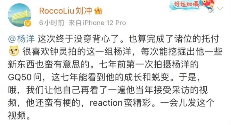 就連雜誌主編都忍不住發文,表示終於完成了諸位的託付,楊洋這次終於沒有穿背心啦!!!!!!!