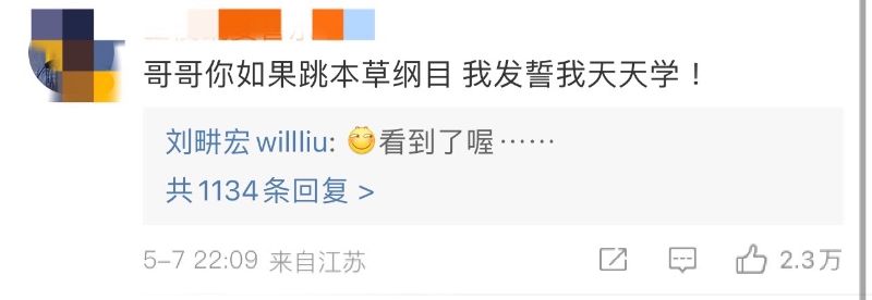 最後,王俊凱微博都在喊小凱跳《本草綱目》,熱評第一的粉絲立flag,如果小凱跳本草綱目,自己也會天天學,立刻被劉教練盯上回復:「我看到了喔……」嗚哇!那就蹲點劉教練速速把小凱變成實至名歸的“劉畊宏男孩”,全體粉絲立刻一起跳本草綱目去唄!