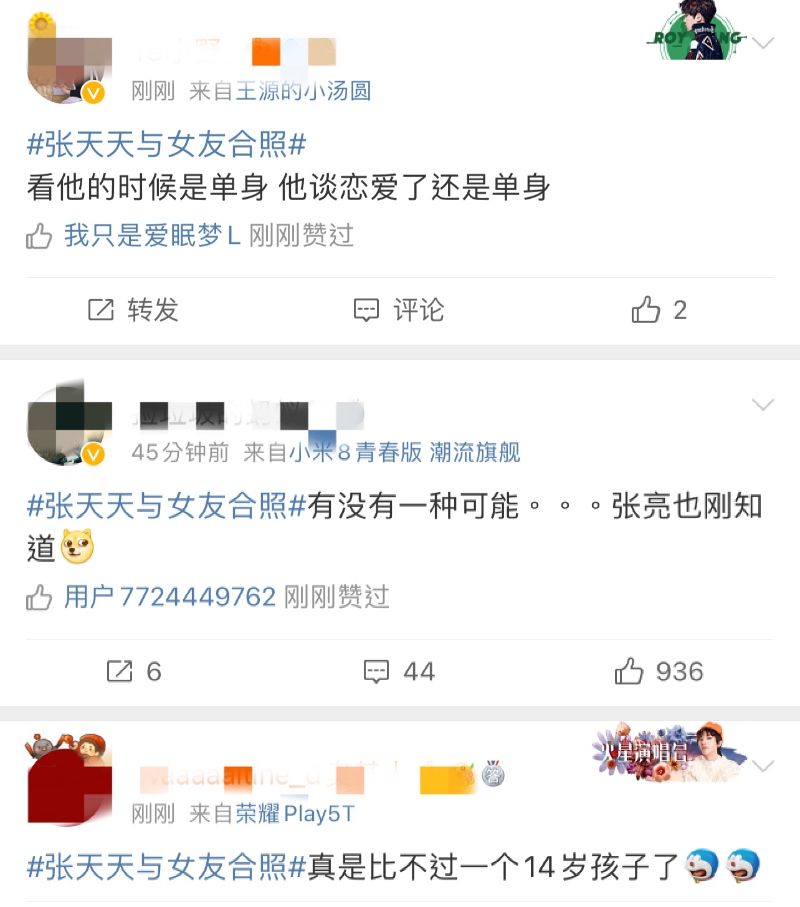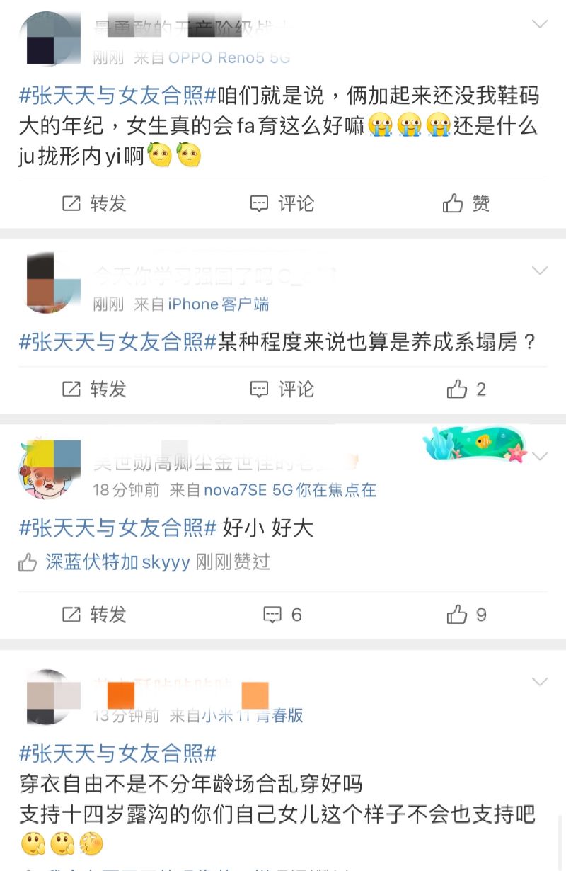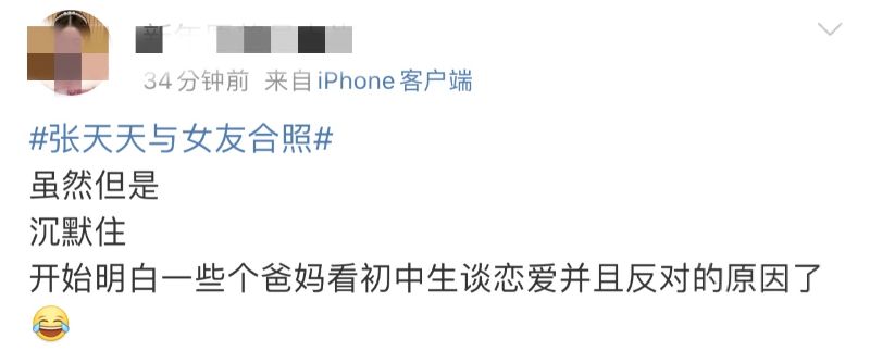 14歲的天天被曝戀愛?大量親密照全網曝光!女友身材成關注點?網友衝張亮微博問真相! 星聞 By 歐巴是我的 On May 9, 2022 Share 媽啊!!!這真的是我們的天天嗎?是噠,曾參加《爸爸去哪兒》的張亮兒子天天(張悅軒),居然被爆戀愛ing? 有網友公開了疑似天天和女友的親密照,只見兩人不但有大量合照,甚至還有親吻、躺大腿等親密照! 讓網友們嘩然的親密照👇 另外,傳聞中是天天女友的身材也引起關注,不少網友紛紛調侃現在小孩都發育這麼好嗎? 網友熱評👇 另外,也有網友跑到張亮的微博下問,到底天天是不是真的戀愛啦? 就,這算是養成系的塌房嗎? 圖來源:部分照片取自網絡,若侵權請告知 Share