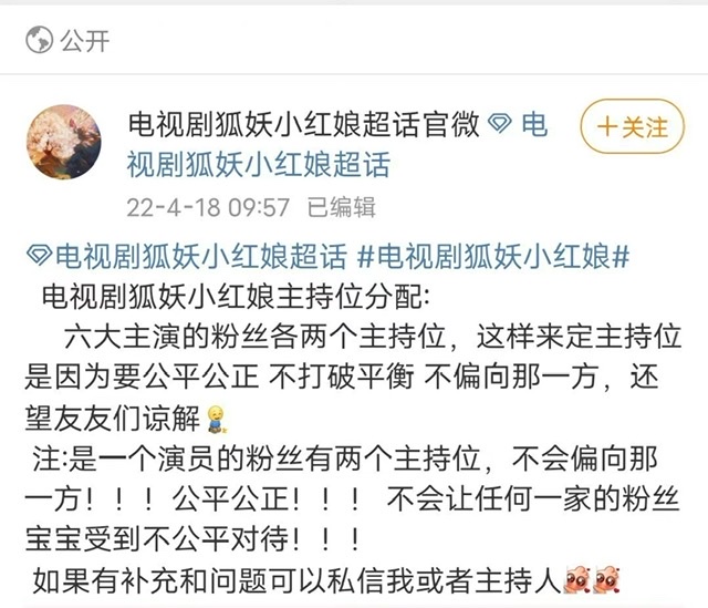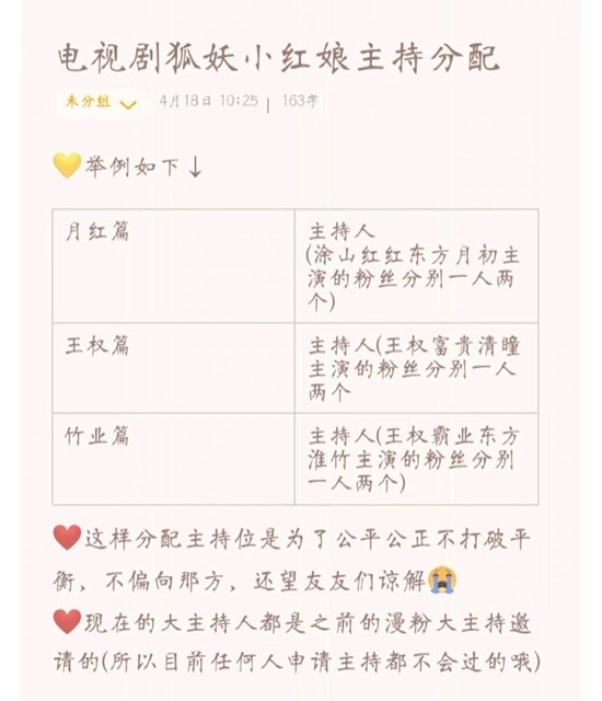 而且也曾在官方超話中,發布狐妖三部曲主演的主持人分配規則⋯所以,算是官方錘了吧!