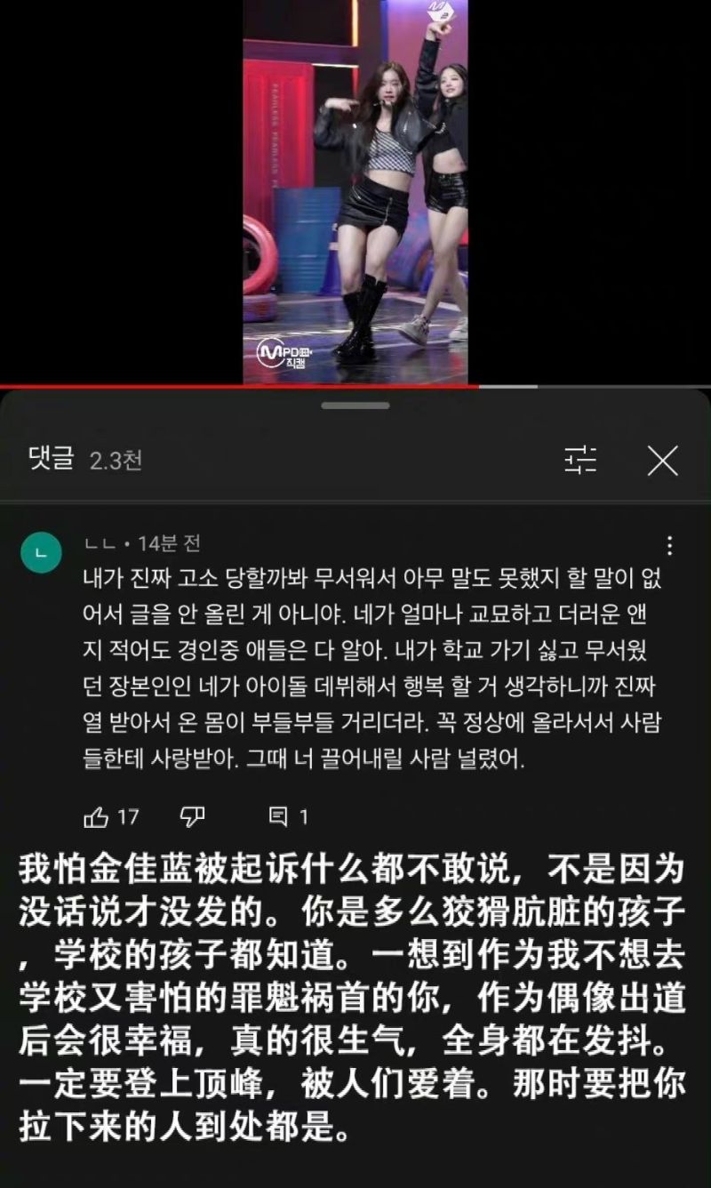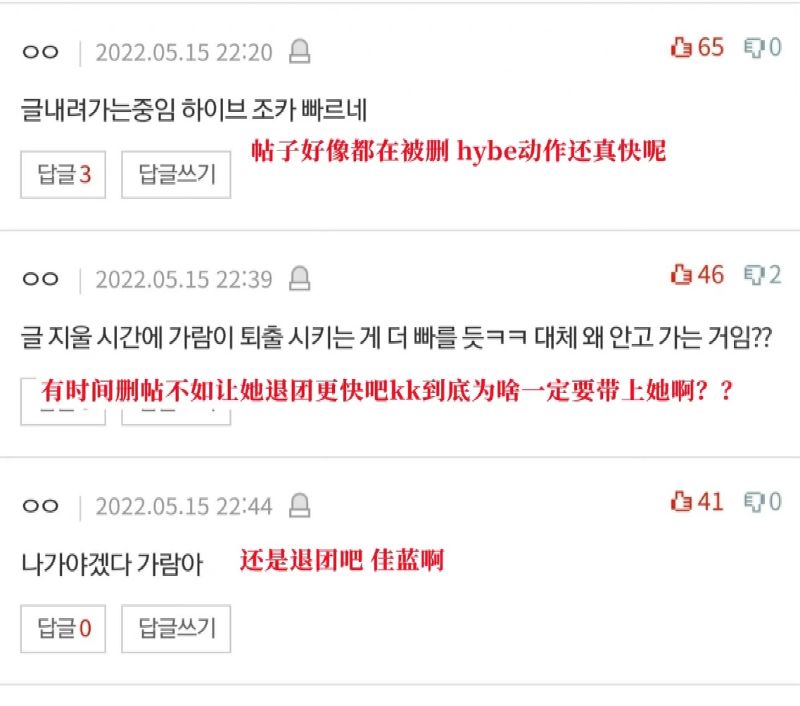 不過爆料原帖很快就被刪除,而在韓國論壇再度引起高度爭議。而金佳藍所屬經紀公司,在16號中午發佈正式立場,表示:「公司原先發表的立場文中沒有要改變的內容。 已經開始采取法律措施,詳細內容將通過法律程序予以確認。」之前,HYBE曾發聲明稱網上對金佳藍的指控全部不實,金佳藍才是受害者。