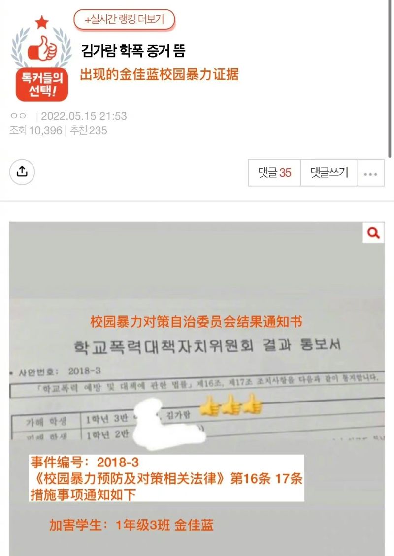 沒想到15號晚上,韓網又再度出現疑似金佳藍涉及霸凌的“證據”,有網友上傳了一張疑似學校通知書的通知書,內容寫明是針對發生在校園的暴力事件措施,而上面的加害者學生名字,正是“一年三班金佳藍”。