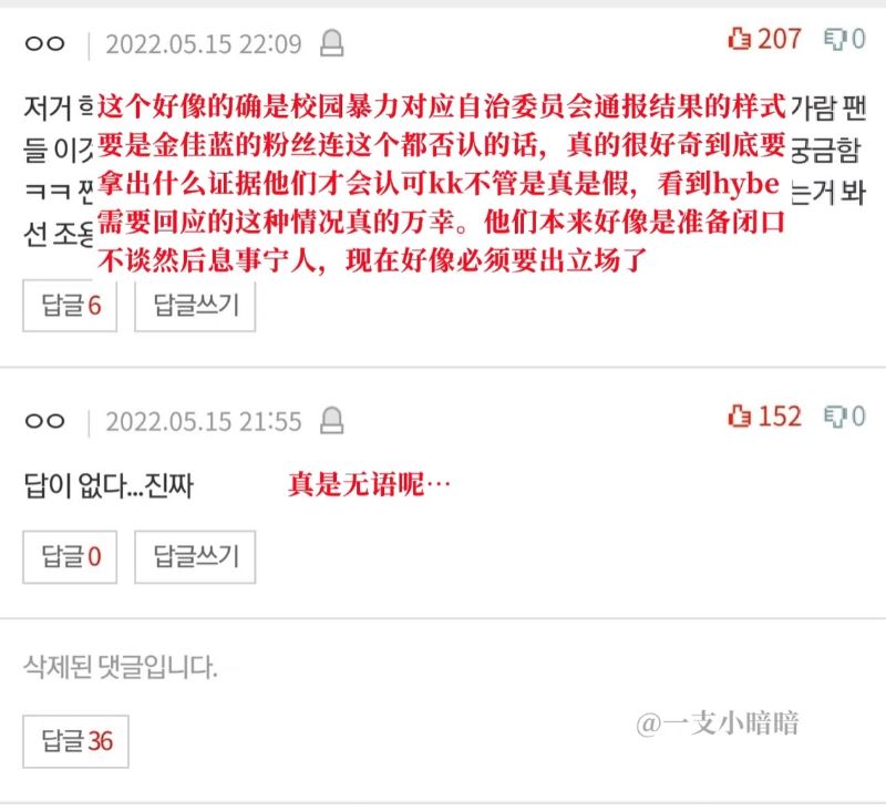 不過爆料原帖很快就被刪除,而在韓國論壇再度引起高度爭議。而金佳藍所屬經紀公司,在16號中午發佈正式立場,表示:「公司原先發表的立場文中沒有要改變的內容。 已經開始采取法律措施,詳細內容將通過法律程序予以確認。」之前,HYBE曾發聲明稱網上對金佳藍的指控全部不實,金佳藍才是受害者。