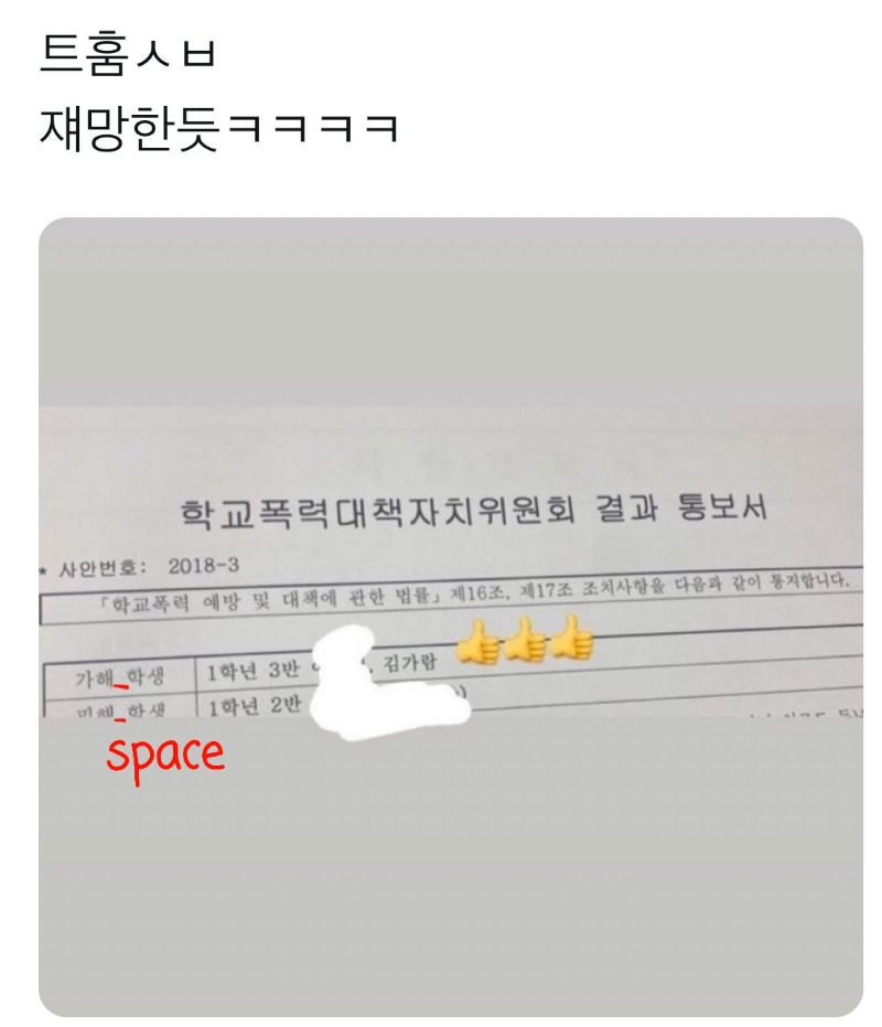 其後,2018年6月4日,校園暴力對策自治委員會會議召開,校園暴力加害學生金佳藍按照“關于校園暴力預防及對策的法律第17條”進行特別教育進修6小時, 根據同條款,也進行家長特別教育進修5小時的處分,校園暴力的受害者A某按照第16條進行心理咨詢及疏導等保護措施。被害人A某因不能忍受持續的集體校園暴力,自願轉學,但被傳言傳為A某被強制轉學,導致A某在轉學後也度過了艱難的時間。