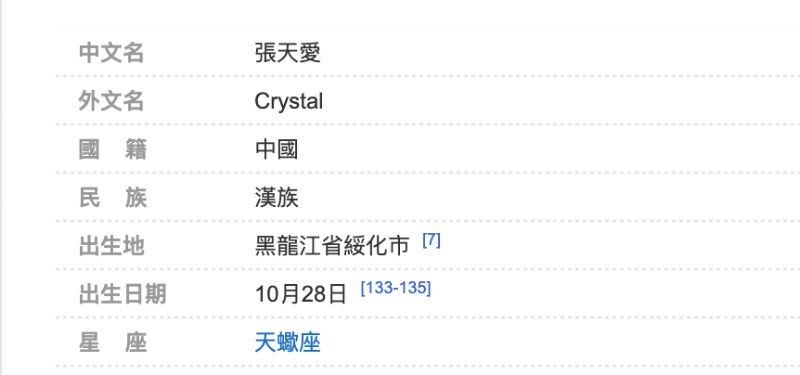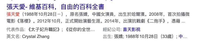 原因是啥呢???這就來看看張天愛的資料,在繁體版的維基百科,她的出生年份是…1988年👇